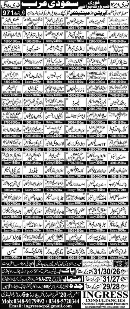 This major hiring drive is being managed by Ingress Consultancies (Overseas Employment Promoters), a trusted recruitment agency connecting Pakistani talent with reputable companies in the Kingdom of Saudi Arabia (KSA). Whether you’re an HVAC technician, electrician, safety officer, or construction worker, there’s an opportunity waiting for you to start a stable and rewarding career abroad.