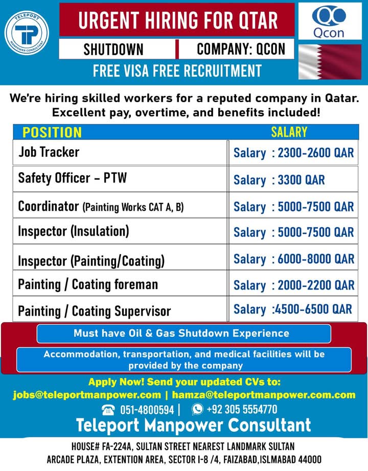 Available Positions and Salary Details for QCON Shutdown Jobs in Qatar Free Visa & Recruitment