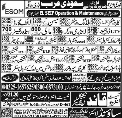 If you are looking for a promising career opportunity in Saudi Arabia, this latest announcement brings excellent news. A well-known Saudi company, EL SEIF Operation & Maintenance, is urgently hiring skilled, semi-skilled, and technical workers from Pakistan. This recruitment is being managed by a reputable manpower office, and candidates with relevant experience are encouraged to apply immediately.