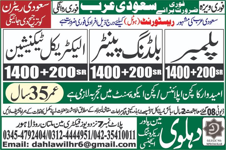 Urgent Hotel Saudi Arabia Jobs 2025, if you are looking for a career opportunity in Saudi Arabia, here’s your chance! A well-known restaurant (hotel) in Saudi Arabia is offering immediate job vacancies for skilled workers. These positions are available for Electrician Technicians, Building Painters, and Plumbers. Candidates who meet the criteria and have relevant experience can apply now to secure a promising future abroad.